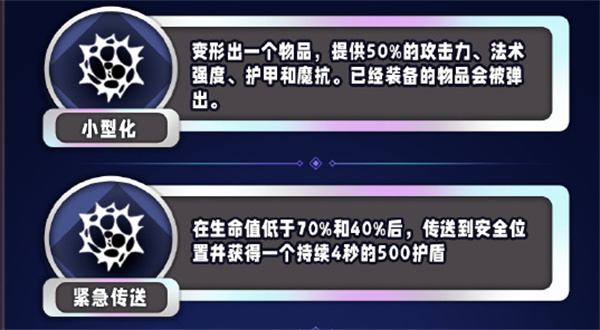 在生命值低于70%和40%后,传送到安全位置并获得一个持续4秒的500护盾。