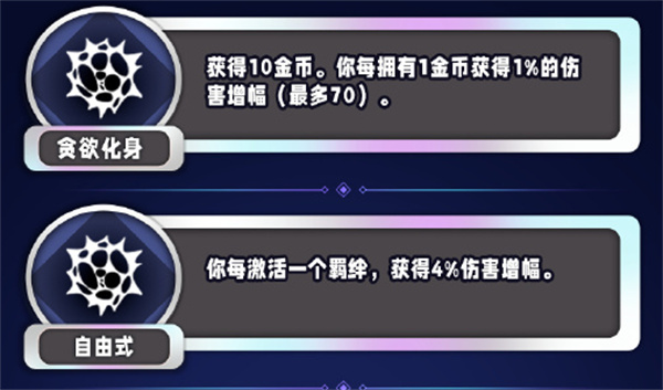 获得10金币。你每拥有1金币获得1%的伤害增幅(最多70)。