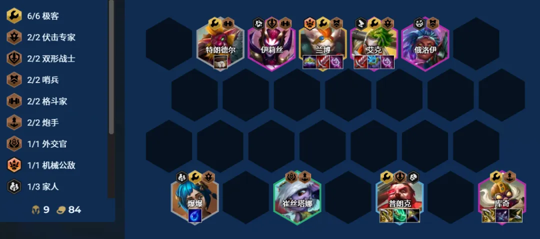 测试中6极客成型后非常强,绝对的版本天花板级阵容,特别是8人口6极客成型后散件会变成契合棋子的成装,直接就能打出装备压制。但这套阵容当前比较吃棋子与装备理解,且阵容需要多枚4/5费棋子,比较贵,建议前中期能连胜才考虑选择。