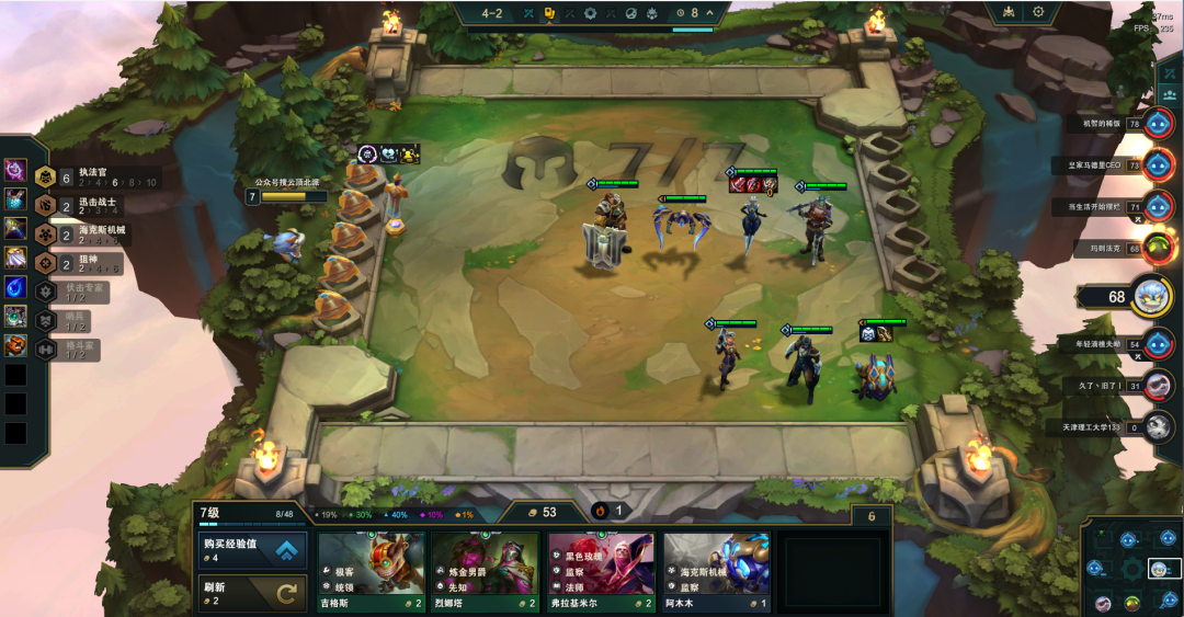 2-1升四人口,2-5升五人口。最优过渡为4执法官搭配巨魔和爆爆组成2格斗家2极客2伏击专家过渡。也可以搭配2格斗家、2哨兵等羁绊。