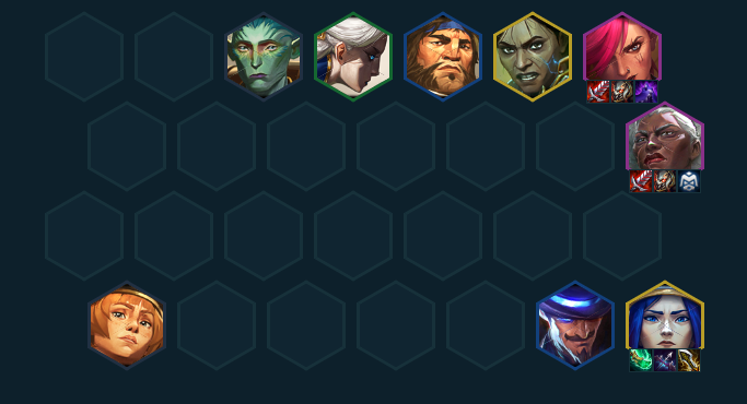 斯特卜、麦迪、卡密尔、洛里斯、崔斯特、蔚、安蓓萨、凯特琳(女警没来前可先用6执法搭配2搏击手、2格斗家等羁绊。)