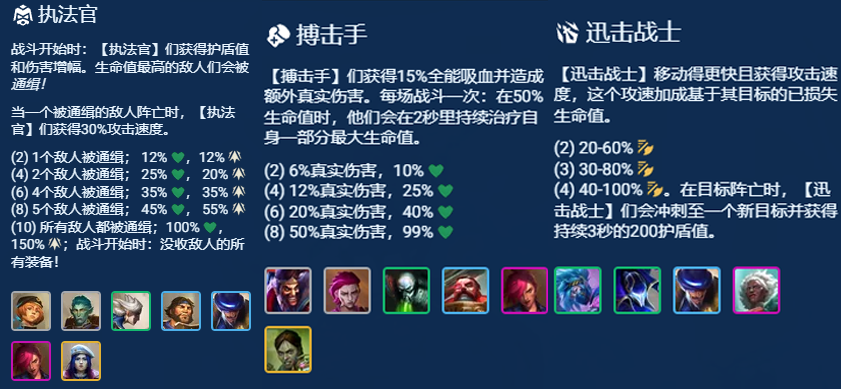 执法官:执法官获得护盾与增伤,并标记n个生命值最高的敌人。敌人被击杀时,执法官获得可叠加的攻速。