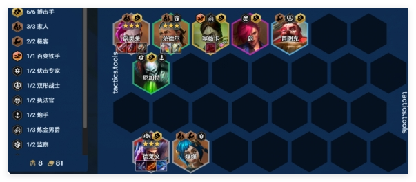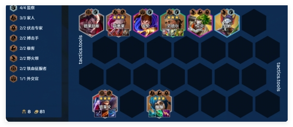 优先保证尉奥莱、范德尔、德莱文的装备和三星,爆爆就可以用下剩下的装备就可以了,因为有伏击羁绊的效果,那么对应的三星也可带法爆,搭配启动装挂重伤也是可以的。