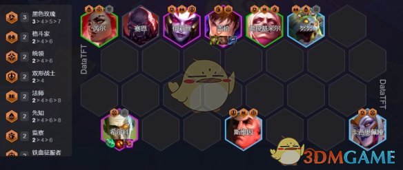 根据前中期的输出装备类型确定玩哪套,老鼠阵容的四费卡较多,4阶段比较容易锁血,如果是法系阵容中期费点劲,需要用希尔科稍微过渡下。