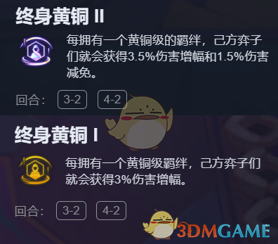 【终身黄铜 II】每拥有一个黄铜级羁绊,己方弈子门就会获得3.5%伤害增幅和1.5%伤害减免。
