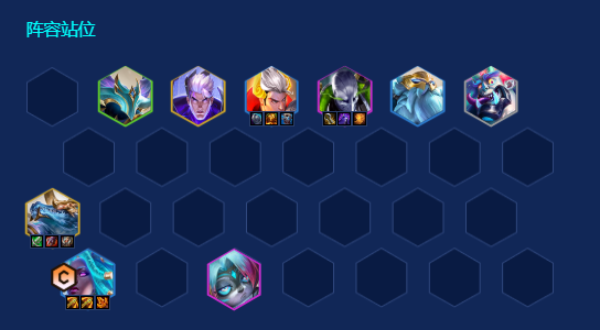 劫站左三右三格位置切后排,皇子站中带减益装备挂BUFF,技能AOE打的足。鳄鱼吃塞纳加攻击力,塞纳有杀手回血不怕掉血。注意上方留个格子让鳄鱼出去。