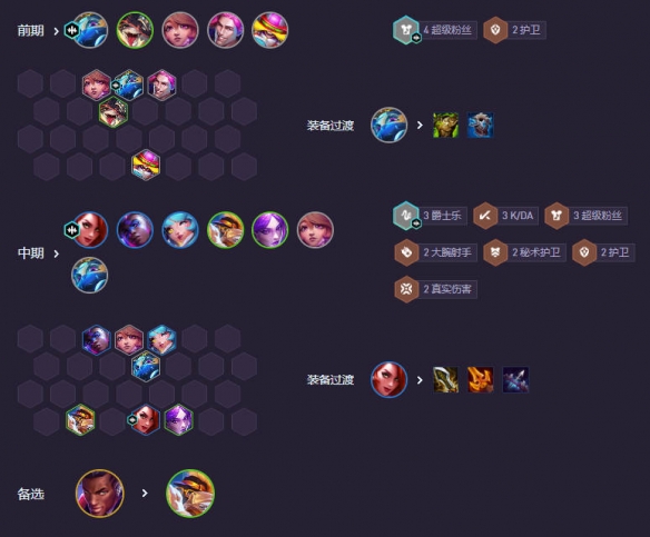 前期建议用3超级粉丝打工,后排用飞机或者金克斯带女枪装备,这是目前比较好的过度方式。