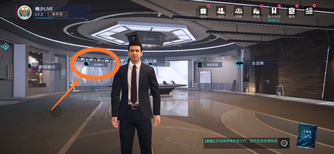 主页大厅的远处有个“街球模式”的选项,点一下就会看到画面中的经理人走向那个“街球模式”的大门,进去后点击开始匹配就可以开启街球模式。