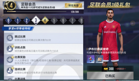 足联会员礼包:足联会员等级由玩家累计充值数额决定。每个等级均配置了折扣力度非常大的足联会员礼包,伊布、坎特、奥布拉克、梅罗等强力球员等待大家获取。