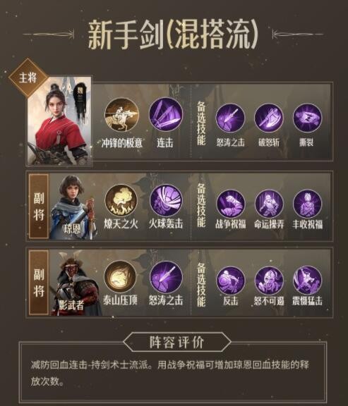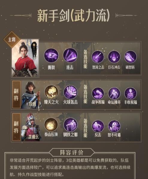 非常适合开荒起步的剑士阵容,3位英雄都是可以免费获取的。队伍发展方面选择较广,可以追求高连击高输出的高爆发流,也可选择续航、持久作战型技能进行搭配。