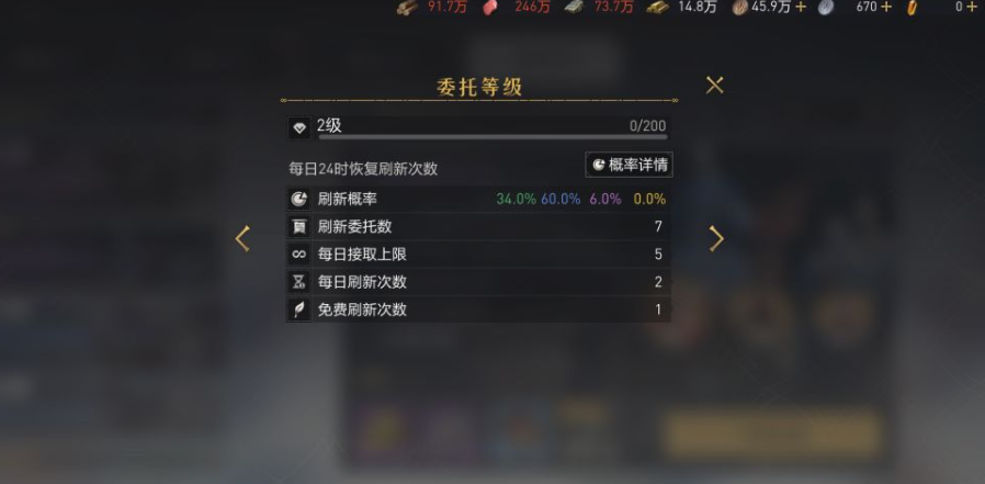 完成任务获取的委托经验可提升委托等级。委托等级越高,获得高品质任务几率越大,任务刷新数、刷新频率和接取任务的上限也将越高。