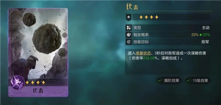 虽然卡面上的伤害率差距较大,毁灭高了95%。但伏击升星简单,满星后触发概率能到25%,此时再去对标白板毁灭差距就缩小了很多,阳谋和万里平戎策也是同理。