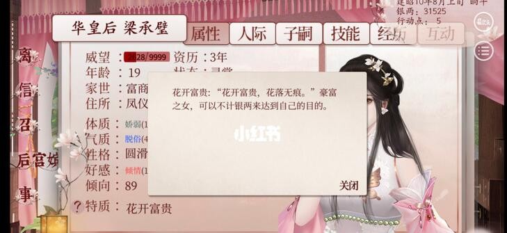 属性:体质850,容貌640+,气质440+,魅力575+,心机600+,诗书40+,音律40+,舞蹈40+,刺绣20,福缘65。
