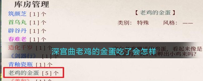 深宫曲游戏中老鸡的金蛋自己吃了没事,还会增加某些属性,但是如果作为礼物送给别的妃子,那么不仅可以涨对方的好感度,还能减少对方的某一项属性!