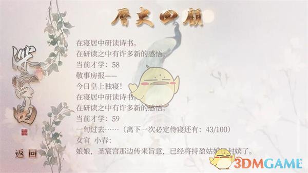 6、宫中有一位资历小于三年,家世为一~三品文官之女,性格为活泼/温婉/圆滑的妃子,大地图可触发择灵与妃子的对话剧情。