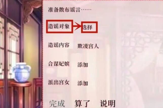 第2步:造谣对象选择为“楚欢”,造谣内容选择为“欺凌宫人”。