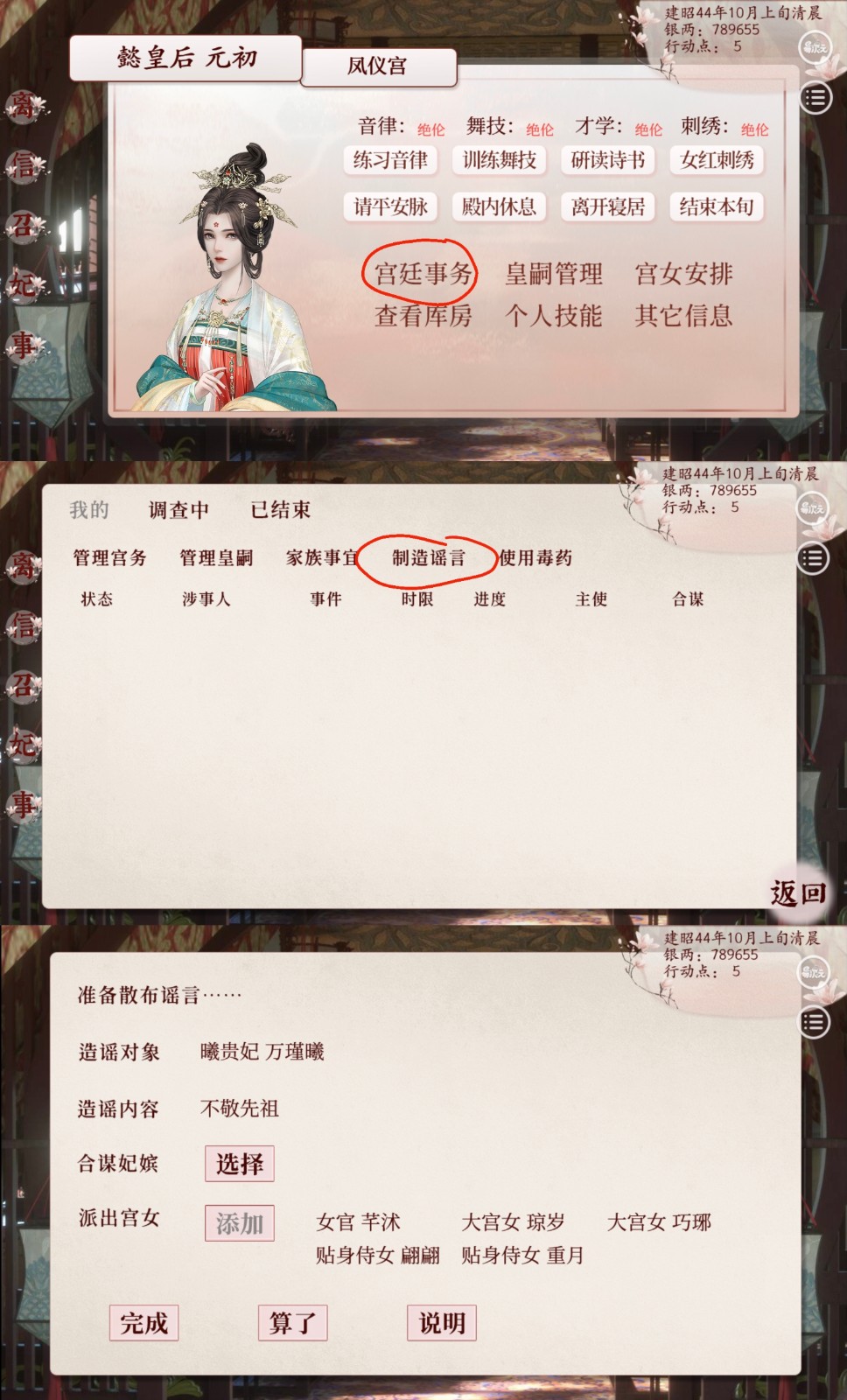1、想要造谣不被发现的话,我们的心机必须足够高,至少需要高于对方不少,不然就会被发现。2、造谣适合钱够的小伙伴们,需要培养一个擅长散播谣言的言女 ,一般喜欢妃只同我交好和其它妃都交恶。3、技巧上,造谣建议使用最狠的不敬先祖,花钱一直拖进度,只要查不出来就是她的错。3、一般来说,造谣适合对付不好下又不想交恶的妃,对方不中套也没关系,损失也不会很大。