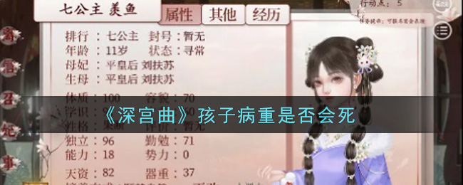 在深宫曲游戏中,孩子病重,尤其是体制降低至0时,是会死亡的。孩子出生时的身体素质不能抵御90,否则很容易生病,同时玩家也可以通过前往丰天楼祭祈福愿增加孩子的属性,孩子生病后可以通过看太医、请平安脉等方式来治病。