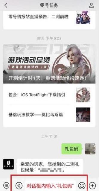 在零号任务公众号,对话框中输入礼包码即可获得礼包码。