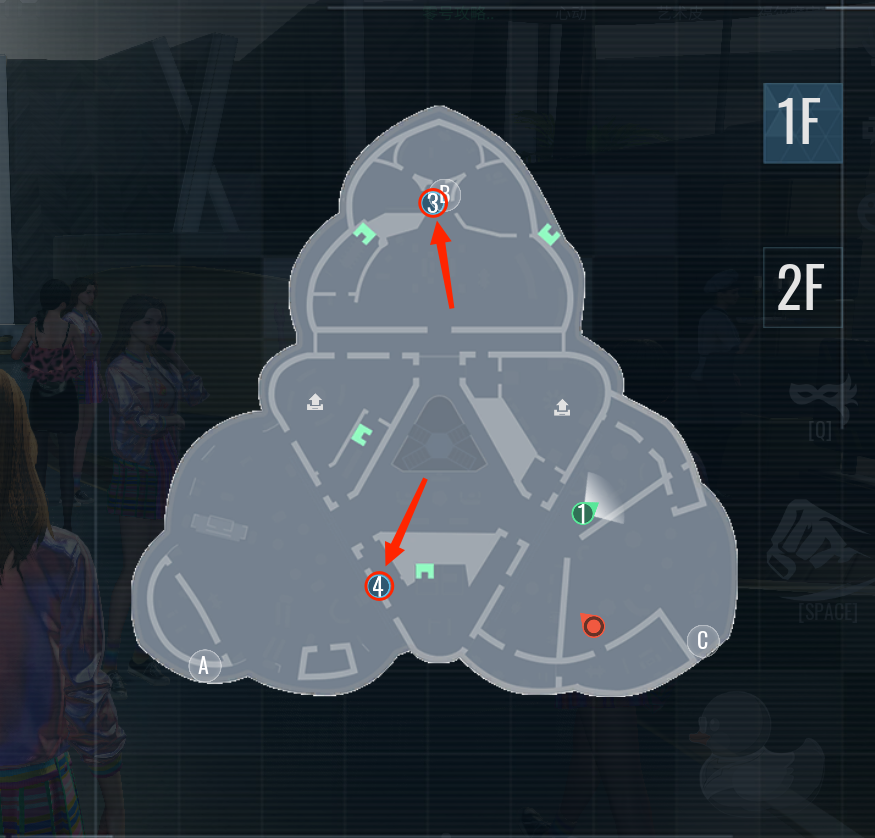 如图所示:地图1层区域一共有3处破译点,地图上分别标注为A点,B点,C点。
