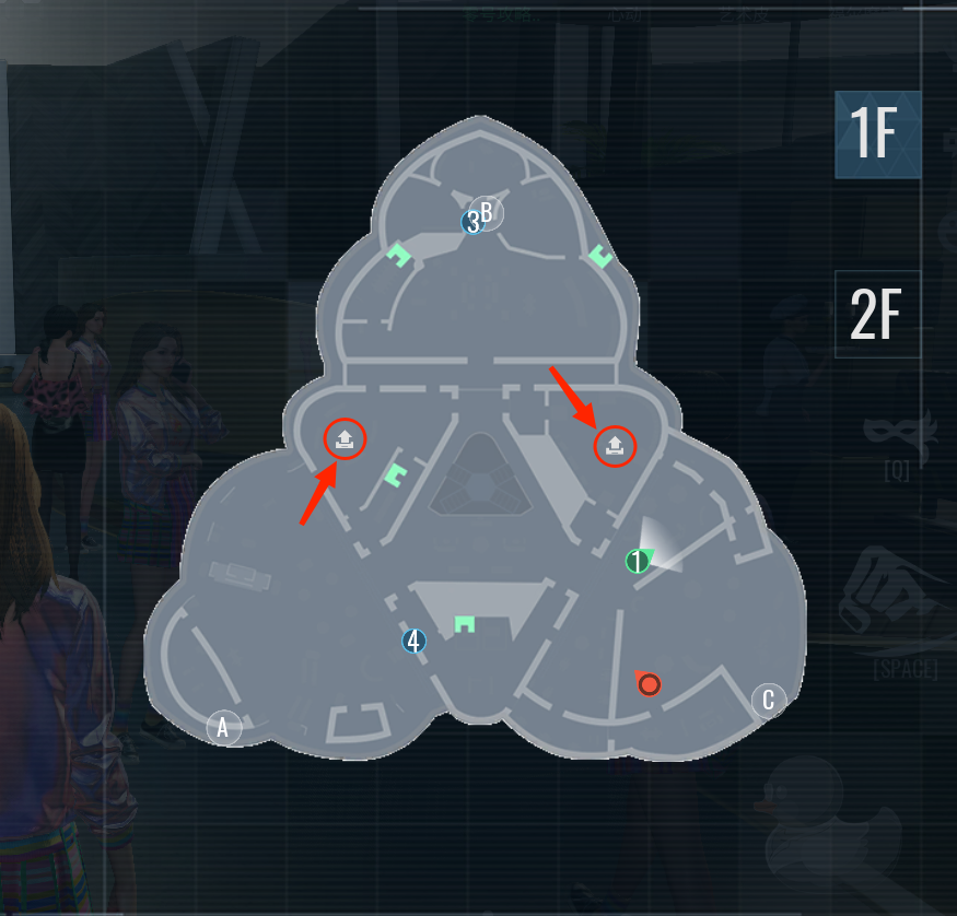 如图所示:地图1层区域中有2处密码上传点位,当玩家破译密码后可以前往这2个位置上传密码。