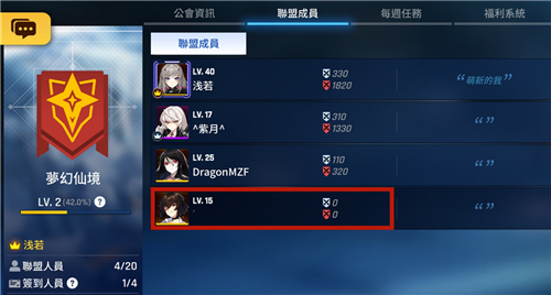 首先在公会界面顶栏中,点击【联盟成员】一项,点击自己这一行。