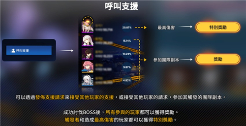 4、挑战需要玩家组成24名员工前往挑战,限时内挑战完成即可获取奖励,同时还可以召唤好友来一起挑战,总之boss相当于互通的,发布支援就可以让其他玩家来帮助你挑战。