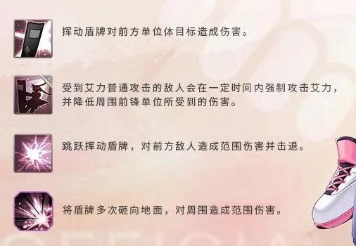 艾力隶属于「支援小队」,是一名可以击退敌人,绊倒敌人,阻止敌人接近的前排防守型角色。