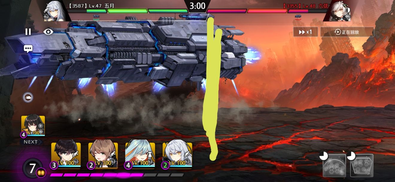 对于防御方来说,有2个优势,一个是船可以帮忙打人(不是技能,是一发一发的普攻)二是可以集中兵力,防御方刚布置的队员就能立即攻击和释放技能,而进攻方得从船中线走几步才能到战线,谁有优势一目了然。需要注意的是,防御方一定要把战线最短也要维持到船尾的位置(如下图)不然战线过短,船容易吃伤害,另外人员密集站不看,一吃aoe和控制就没了。