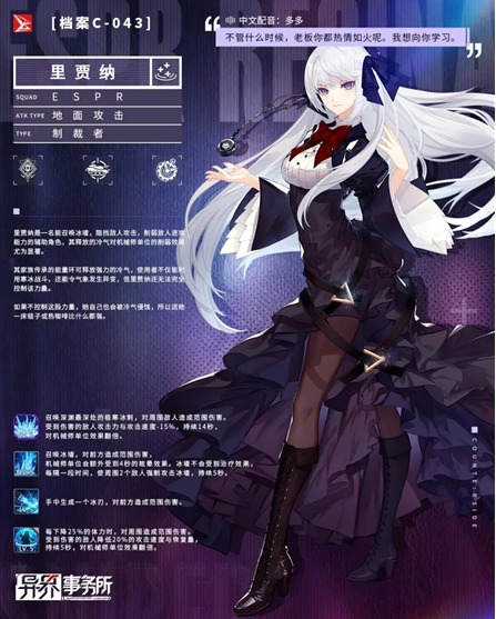 里贾纳外号冰女,得名于他的招牌特殊技。作为3费辅助角色,有着优秀的控场能力与保人能力,没有辱没通行证角色的名声。