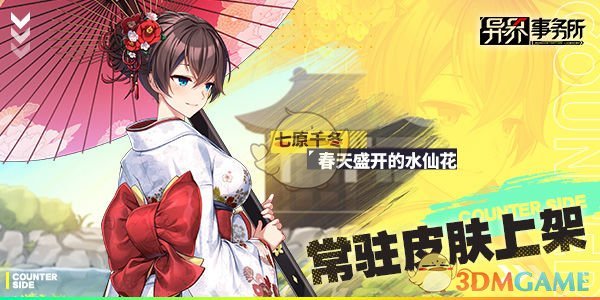 本周例行更新维护后,皮肤商店内的常驻橱窗,将上架三款和风限定皮肤。【七原千冬—春天盛开的水仙花】,【菲奥尼—隐秘的休假】,【埃里奥斯—特别的休假】,老板可选择钟爱的皮肤款式,将她们全新的样子接回公司。