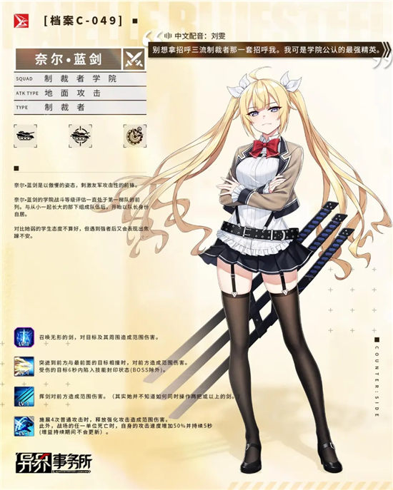 · 奈尔·蓝剑的学院战斗等级评估一直处于第一梯队的前列。与从小一起长大的部下组成队伍后,开始以队长身份自居。