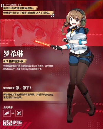 罗希琳是个SR机务人员。她的主动技能为解除己方机械单位所有DEBUFF,且8秒内让他们攻速提升15%。