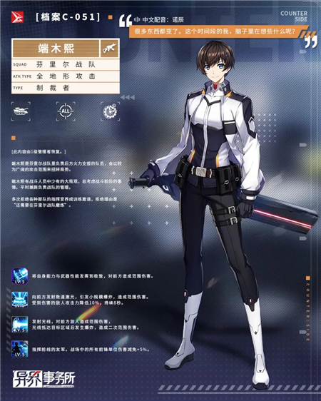 端木熙,3费突击角色。在他觉醒前,曾和李秀妍一起隶属于旧管理局的芬里尔战队,在队长希尔德的带领下,消灭侵蚀体,拯救世界。然而在一次特别任务中,他们遭遇了6级侵蚀体塞菲拉守护者的入侵,面对末世般的绝望,年轻的端木熙与李秀妍却因不明原因被身为老师兼队长的希尔德抛弃了。