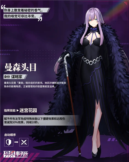 在异界事务所游戏中,曼森头目是最近上线的SSR机务员,相信很多玩家还不清楚曼森头目的技能是什么。接下来就让小编给大家带来《异界事务所》曼森头目技能介绍,感兴趣的小伙伴们一起来看看吧。