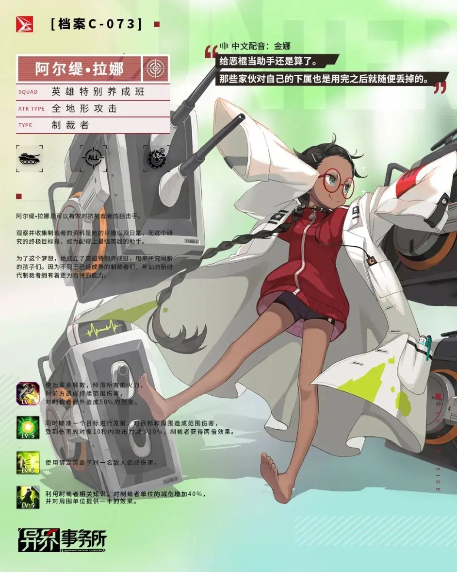 眼镜狙是2费对制裁者特攻狙击,面板较差。普攻远距离单体伤害,被动自身受制裁者伤害降低40%,为周围我方单位提供一半效果(升满buff额外增加对制裁者增伤20%,周围我方提供一半效果),特殊技造成远距离范围伤害并控制,受害单位短时间降攻10%,对制裁者效果翻倍,大招造成远距离持续伤害并控制,对制裁者额外造成50%伤害(升满最后受害单位技能封印8s,boss除外)