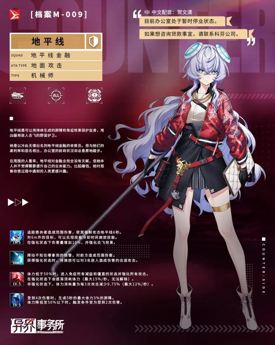 她是以冷血无情出名的地平线金怕的收债员。但与她们的高利率和恶名相比办公室的财政状况却总是原地踏步。在周国的人看来,地平线对金融业完全没有天赋:但她本人并不觉得需耍提升自己的业务能力。比起赚钱,她对观察收债过程中遇到的人类更感兴趣。
