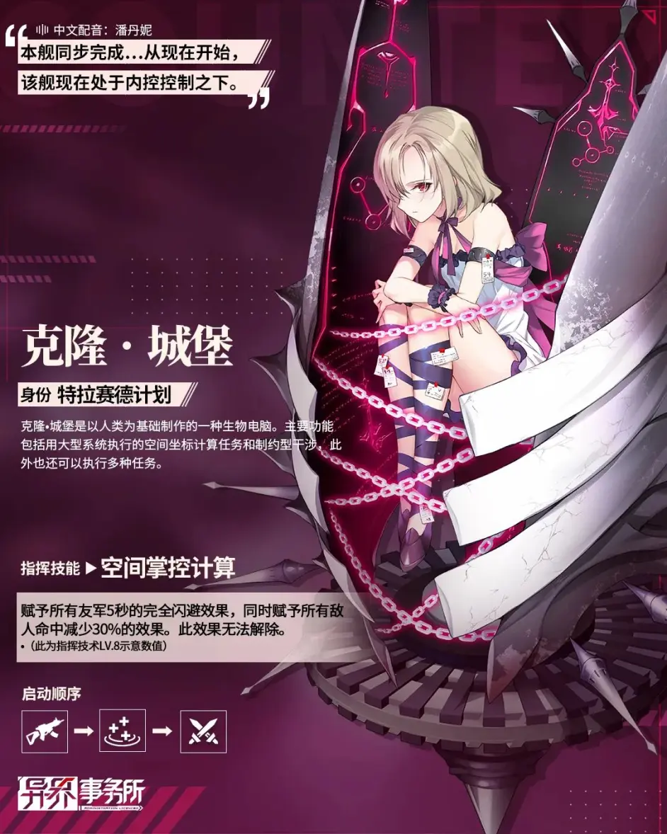我们生活的世界与另一个世界发生了重叠,拥有强大而特殊力量的侵蚀体正在破坏我们的家园。这时,人类中涌现出很多“制裁者”,他们凭借“能量环”给予的超自然力量与侵蚀体进行战斗,努力守护着现实世界。她们对战术有执着与信仰,靠着卓越的见知探索胜利的路,本次维护后,机务员SSR克隆城堡将会上线,那么异界事务所机务员克隆城堡怎么样,下面就由小编给大家带来机务员克隆城堡技能介绍,希望能给大家带来帮助。