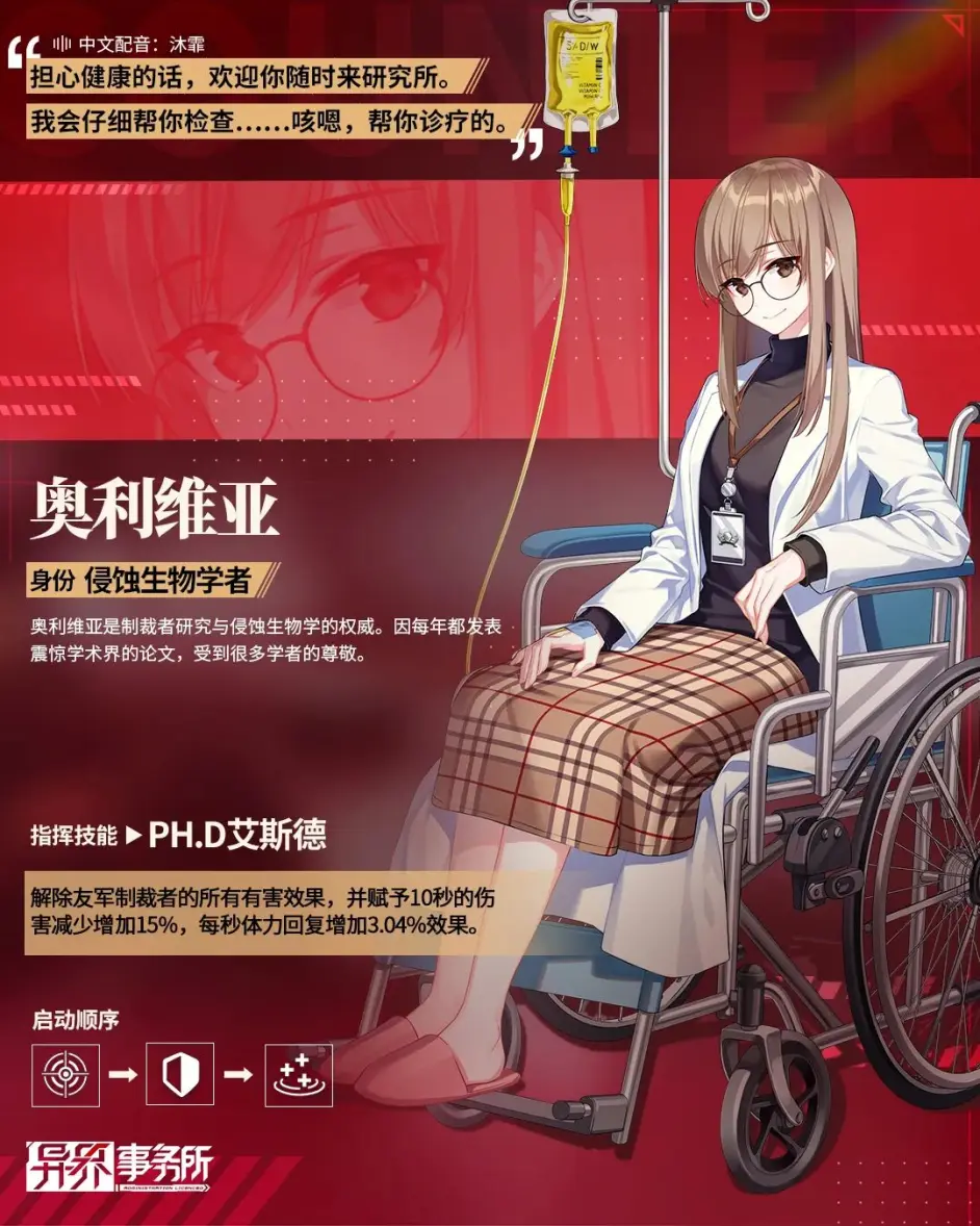 我们生活的世界与另一个世界发生了重叠,拥有强大而特殊力量的侵蚀体正在破坏我们的家园。这时,人类中涌现出很多“制裁者”,他们凭借“能量环”给予的超自然力量与侵蚀体进行战斗,努力守护着现实世界。她们对战术有执着与信仰,靠着卓越的见知探索胜利的路,本次维护后,机务员SSR奥利维亚将会复刻,那么异界事务所机务员奥利维亚怎么样,下面就由小编给大家带来机务员奥利维亚技能介绍,希望能给大家带来帮助。