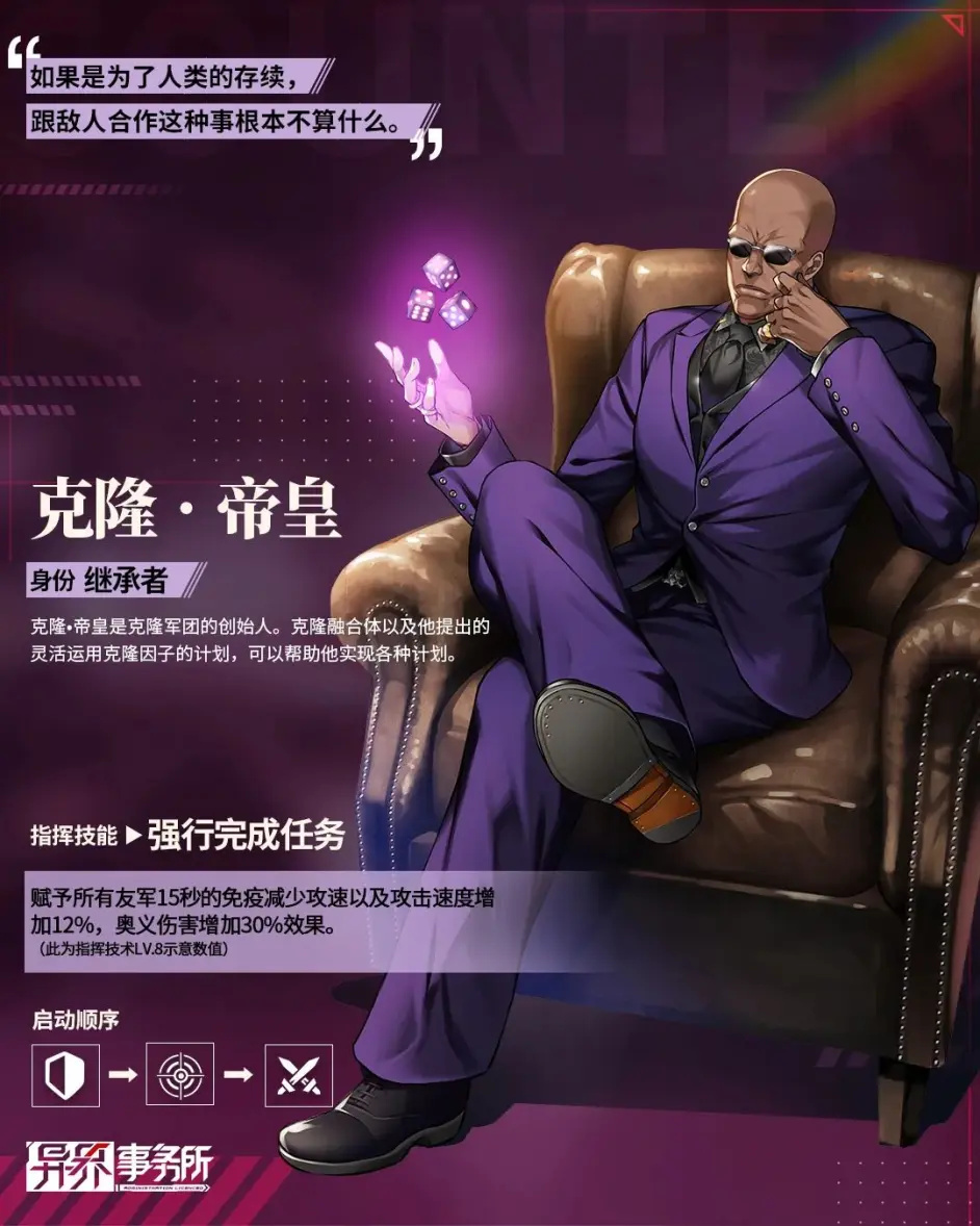 克隆.帝皇是克隆军团的创始人。克隆融合体以及他提出的灵活运用克隆因子的计划,可以帮助他实现各种计划。