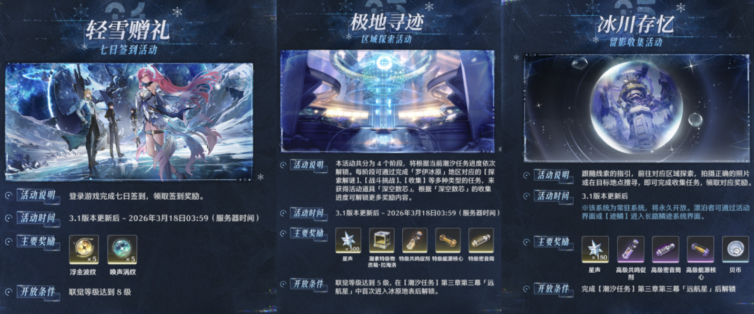 鸣潮3.1版本在今日正式上线,作为新春版本,其上线的活动内容还是相当丰厚的,还有全新限时活动登场。并且将为玩家送出海量福利。那么3.1版本的更新活动有哪些呢?下面为大家分享3.1版本的活动内容。
