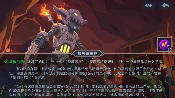 机械哥布林主要的难点是能源晶核会让所有进场的生物获得速攻(地狱难度下我方无法获得速攻效果)效果,而且机械哥布林的牌组本身也是偏向快攻的,如果你是控制(主打中后期)卡组的话可能会在前期被抢掉很多血。