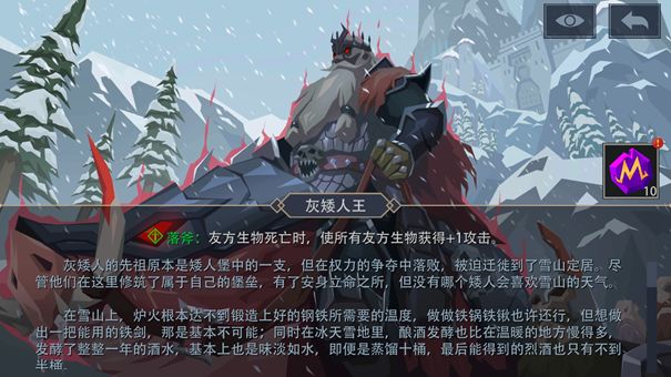 灰矮人王也是一个比较棘手的精英,主要难点在于他的生物攻击成长非常快,很容易造成我方生物刚召唤出来就被对面生物压倒的不利局面,他的高攻怪配合附加透骨、穿透等特性的法术牌很容易对我方造成大量的生命值损失。