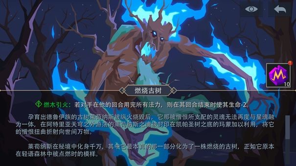 燃烧古树最令人烦恼的是他的被动效果——如果你在回合结束时剩余法力为0,则受到2(地狱难度为4)点伤害。在高难度下这个技能的伤害值会提升到4,即使你能很顺利的赢得战斗,也会受到10-20点的生命值伤害。