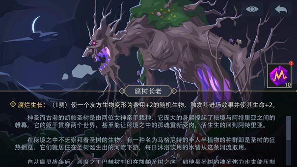 遇到腐树先知,必须先处理了他的风灵十字弓,不然他大量的衍生物不管是进场还是离场(包括死亡)都会对你造成3点生命值的伤害,如果你满场怪他下一个苔藓树蛙,(他的卡组中没有,不过会随机进化出来)触发风灵十字弓的特效你会直接掉15点血,之后你每击杀一只树蛙自己也会掉3点血,属于即使是打过了也会损失大量生命值的强敌。