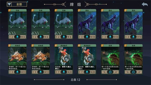 初始牌组中可直接将荆棘虎、恐狼、黑豹替换掉,其中的黑铁骑兵、怒袭还是非常不错的,删卡不用太早,有更好的选择可以直接献祭加费,前期需要找到衍生物进行核心牌组的替换;