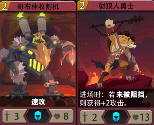 收割机是所有速攻卡组的好伙伴,配合咱们的被动很容易能够获得一个5攻以上的收割机,豺狼人勇士加攻效果经常进场就可以触发,就算后面被阻挡攻击力也不会掉回来,作为替换1、2费的卡牌这两张都非常优秀,而且获取容易;