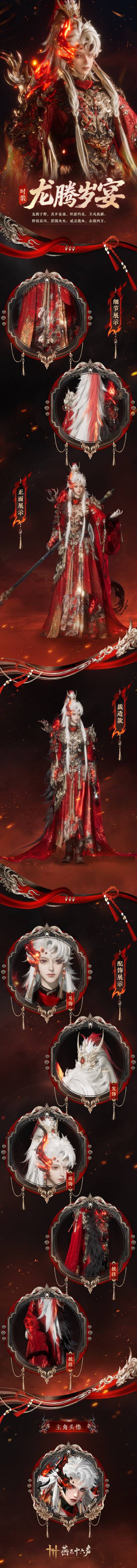 套装【龙腾岁宴】上线的同时将开启「裁造」功能,可将默认款服装裁造为【龙战于野】款式。龙战于野,鼓角吞疆,气撼九霄,啸吟苍茫。