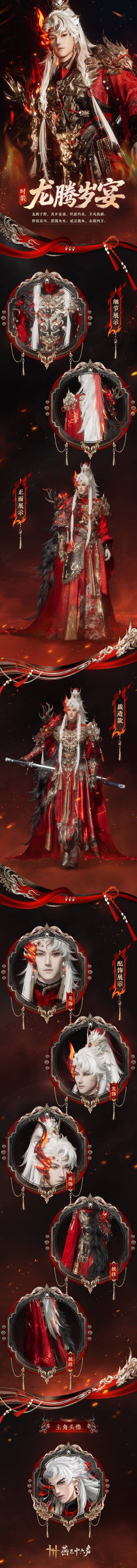沙场之巅,有龙腾之姿者,睥睨四方。红色衣袍翻涌如焰,肩上神龙昂首,似携御火之势,腾跃而出。龙角面饰,灼灼生辉,尽展威镇四方的气势。挥师所指处,龙威所至,永镇四海晏康。