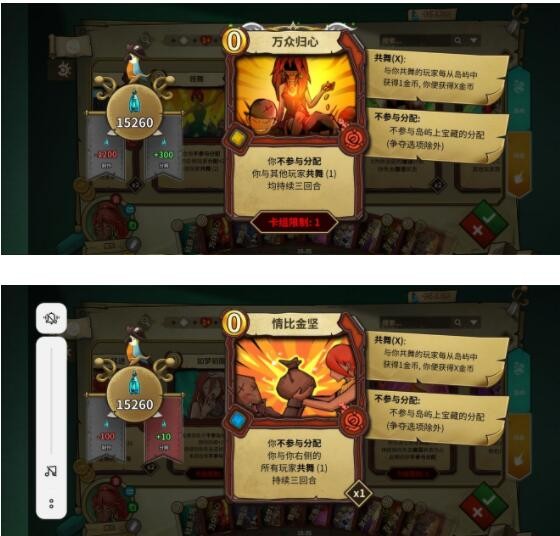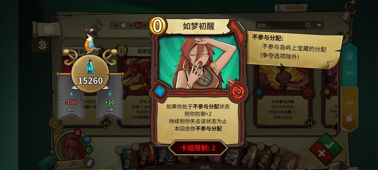 打法其实很简单,在积攒了一定的手牌之后进入不分配状态,通过共舞拿钱,用如梦和喝茶保护自己,赢点就在绿岛吃别人的分配以及苟到最后拿终局奖励。